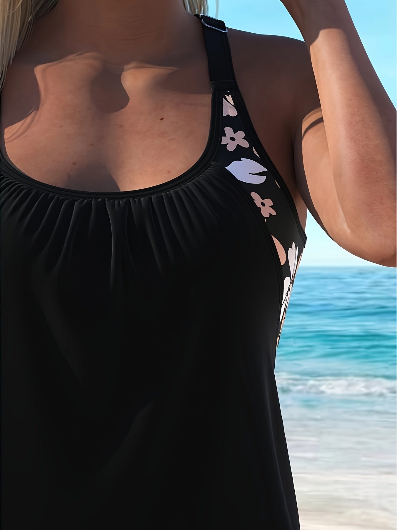 • TANKINI TOP FOR WOMEN: This racerback bathing suit top provides ample support. The black & green floral print blouson tank top creates a slimming and charming look.