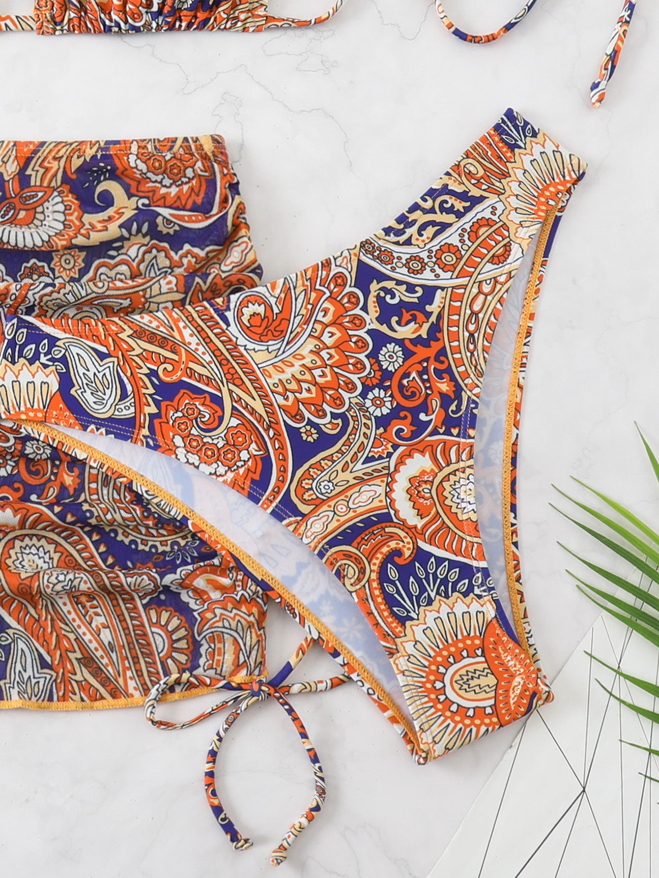 - Features: 3 piece swimsuits with matching cover up skirt, tropical tree print, fishnet bikini, halter triangle bikini top with side tie bottom with ruched mini skirt, beach boho bathing suits