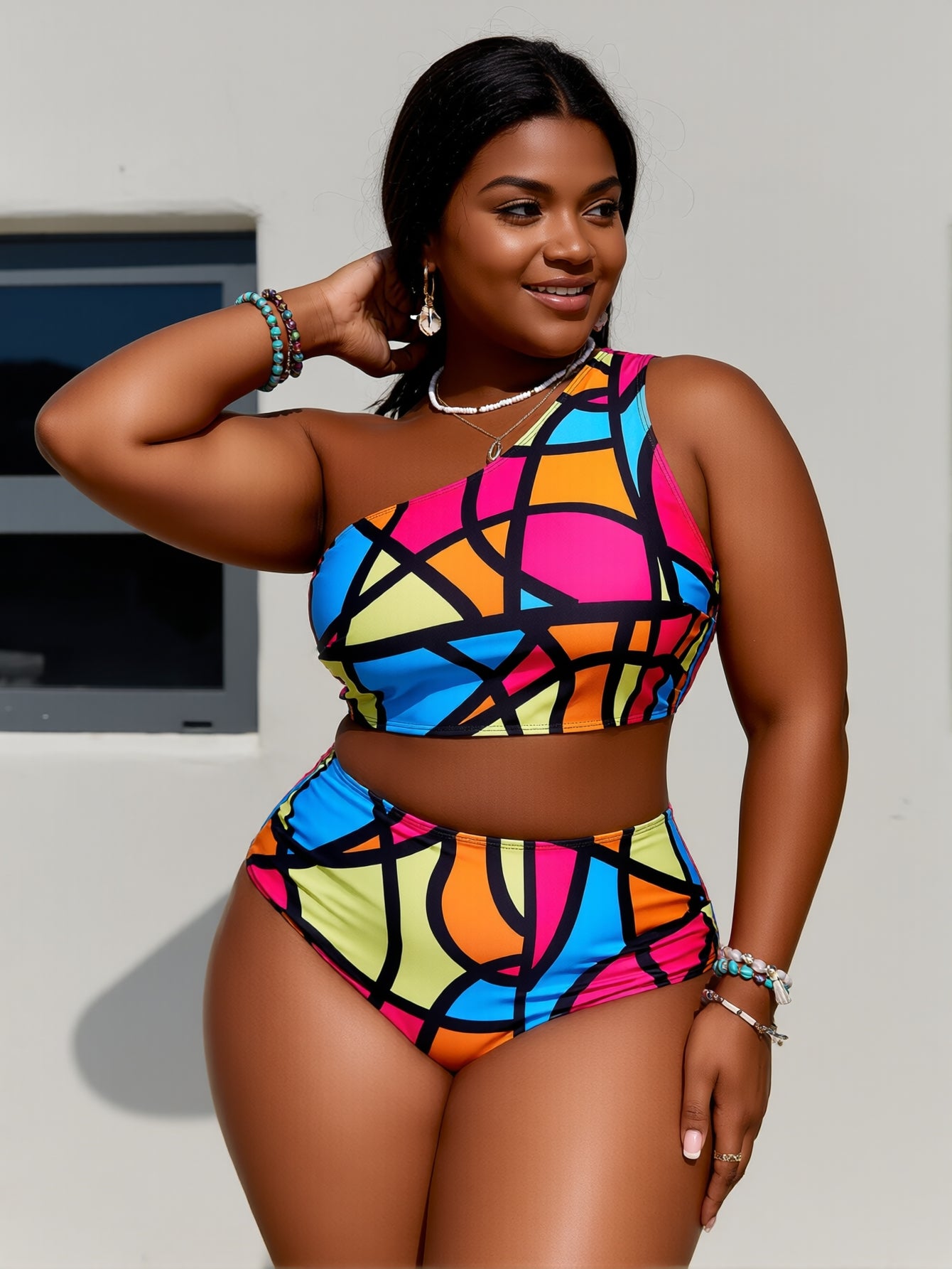 Women PLUS SIZE High Waisted Bikini - One Shoulder Bathing Suit Tummy Control Two Piece Swimsuit