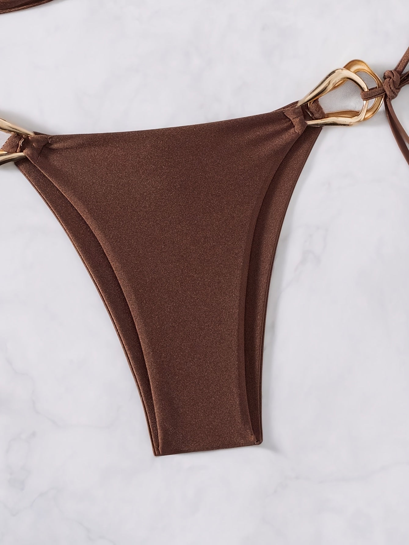 - Design: Adjustable halter v neck bikini top with tie at back, metal ring linked front, removable push up padded cups, offers great support and enhance your shape. mid waist high cut cheeky bikini set giving you a chic look.