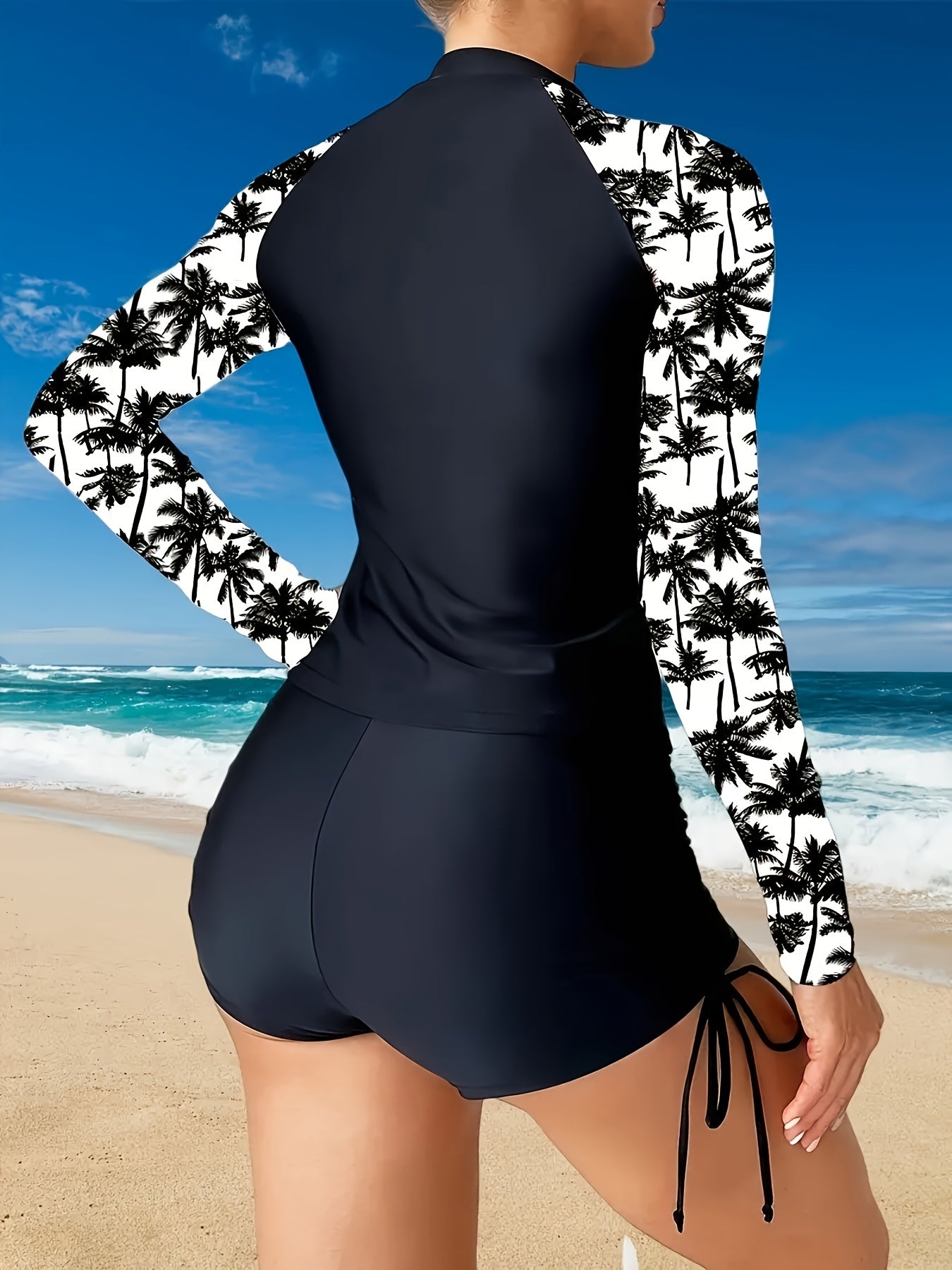 - BUILT-IN SUPPORT & DESIGNED FOR CONFIDENCE: Move freely with total confidence. The swim shirt includes a built-in bra with non-removable pads for reliable support and a flattering shape. The matching boyshorts bottom feature a secure 2-in-1 design, ensuring you stay comfortable and covered whether you're swimming, surfing, or playing beach volleyball.