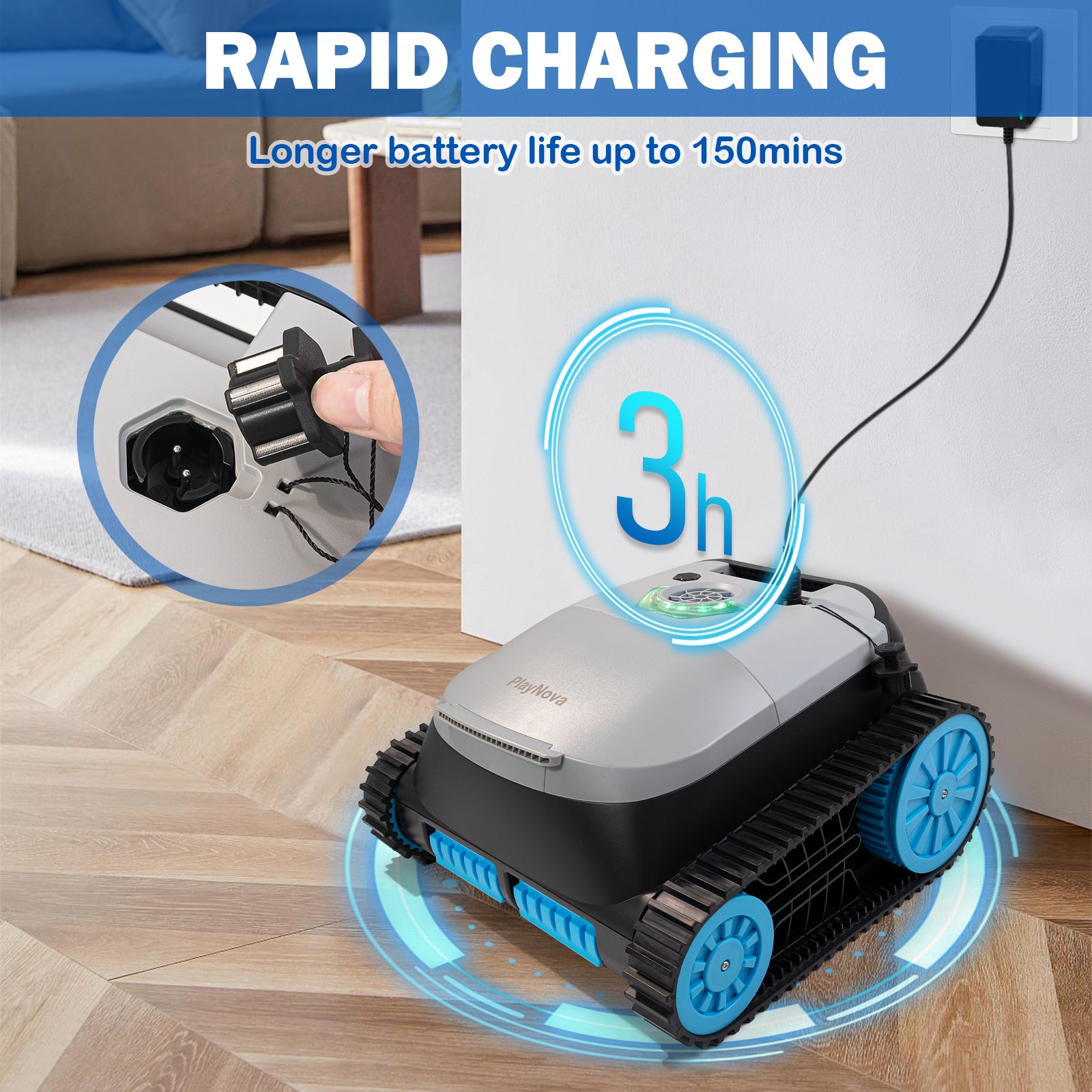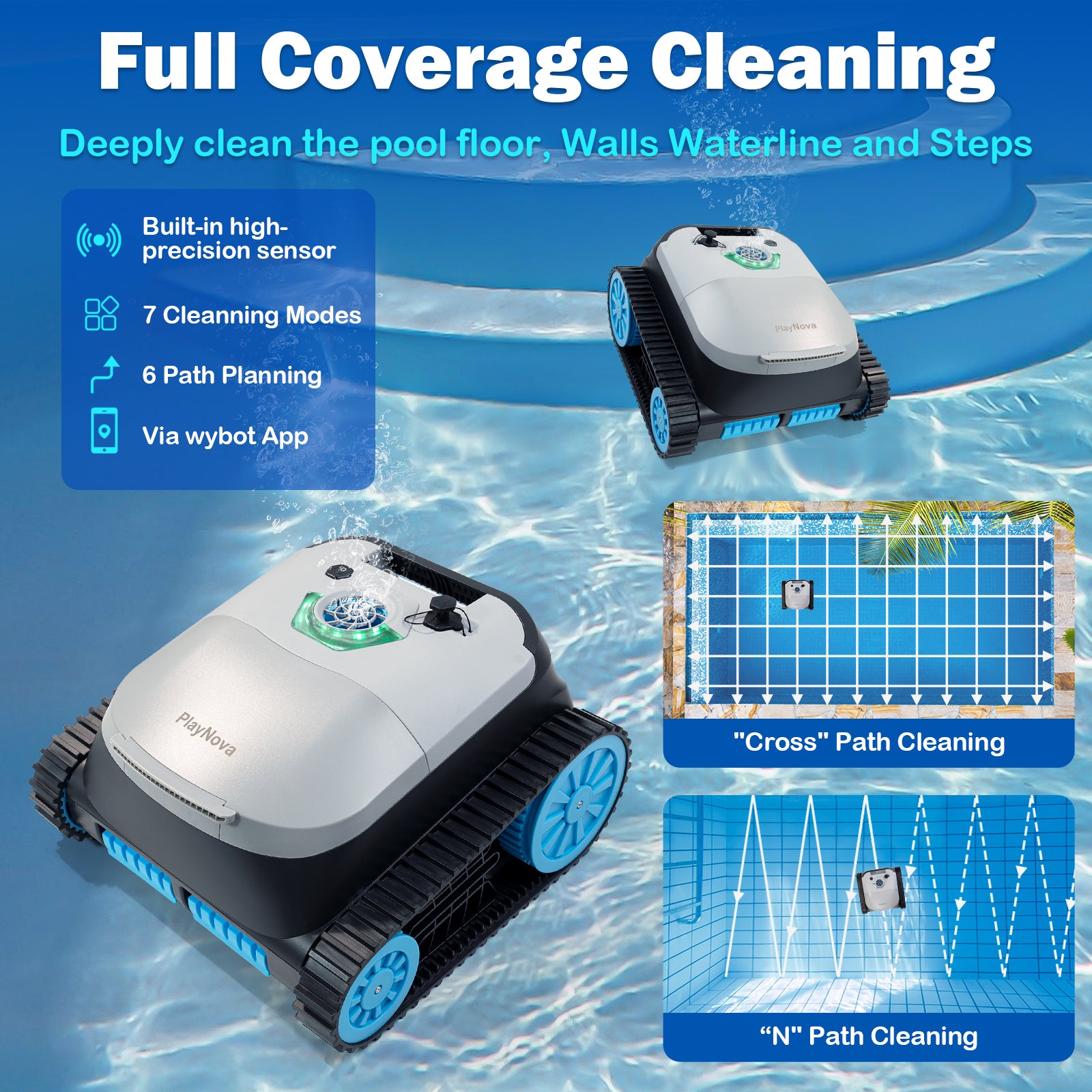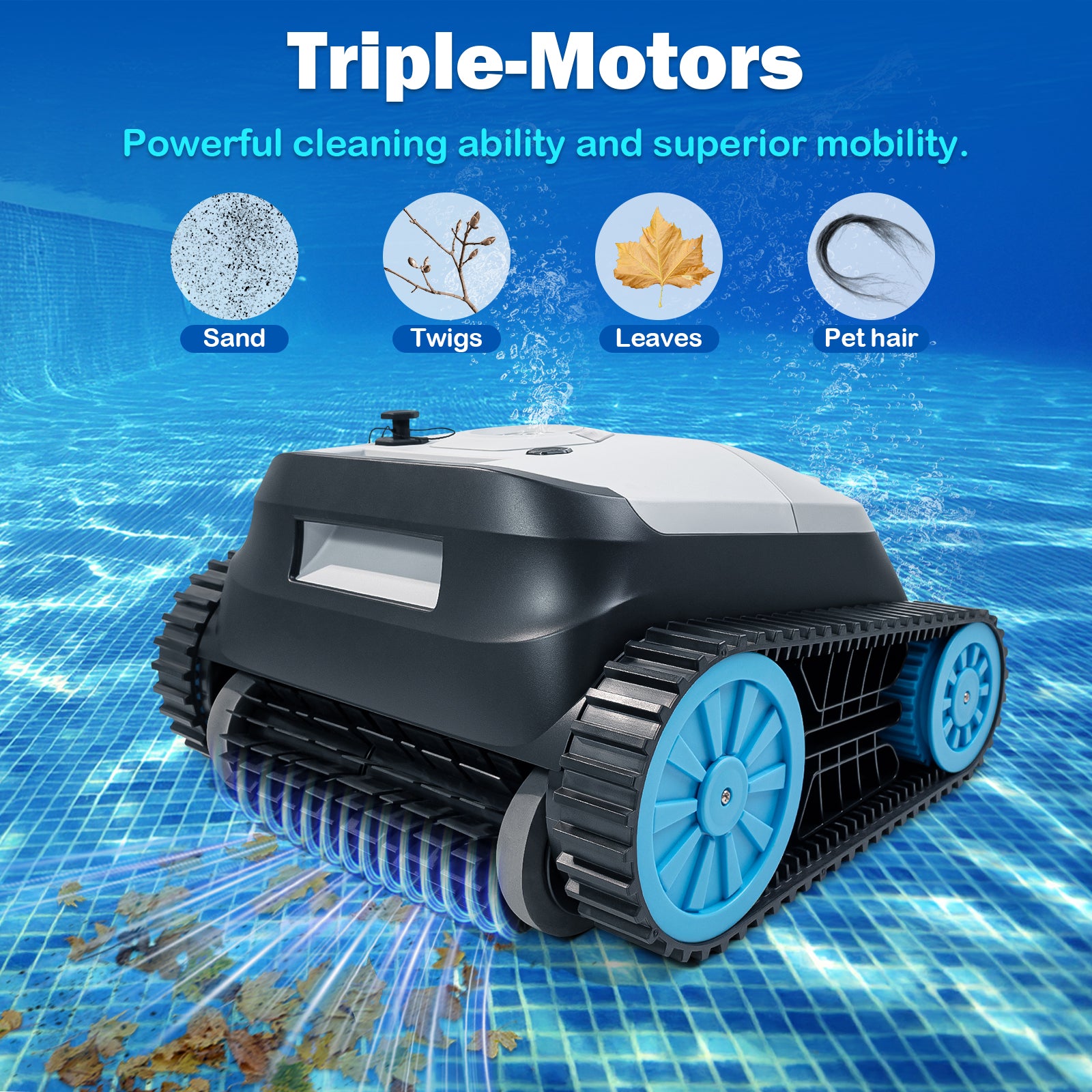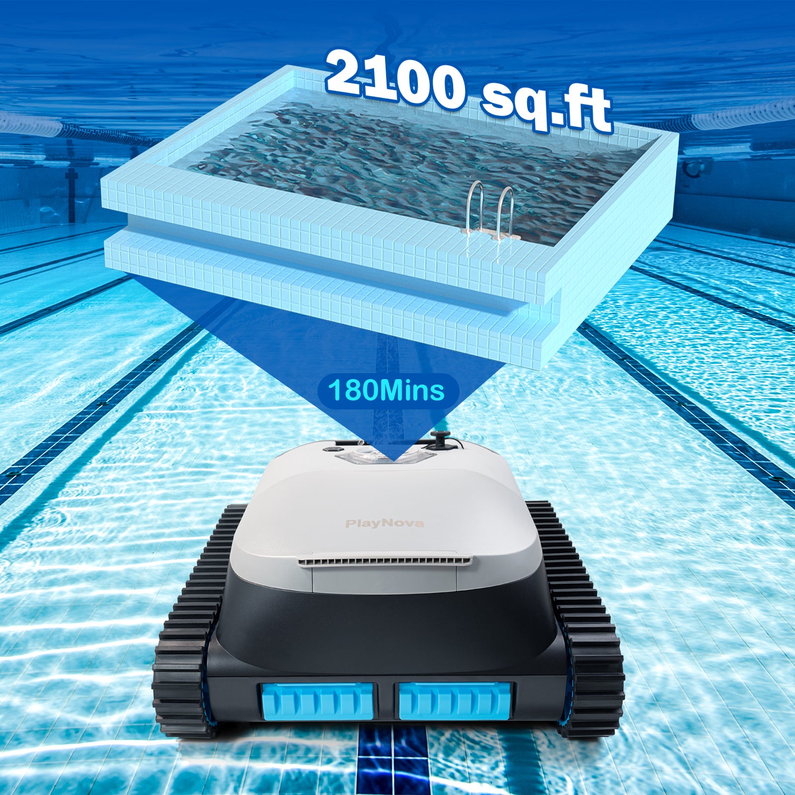 - Triple Brushless Motors & Unmatched 5500 GPH Suction: Powered by three premium brushless motors, the PlayNova robotic pool vacuum delivers ultra-strong 5500 GPH suction while consuming less energy than standard models. It effortlessly lifts leaves, sand, hair, gravel, and small twigs—transforming murky pools into crystal-clear retreats, no manual scrubbing required