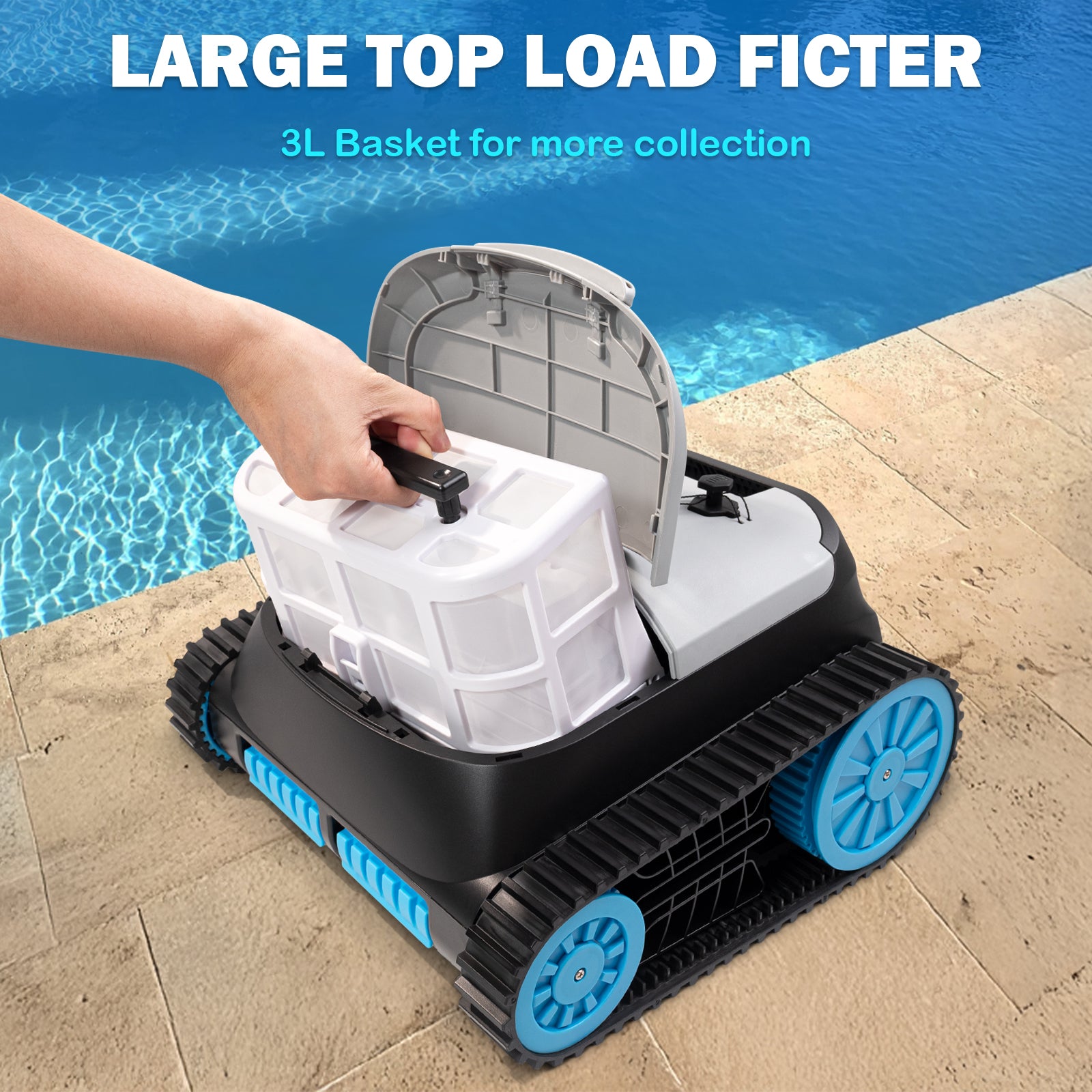 - Built for All Pools, All Surfaces, All Shapes: Designed for both in-ground and above-ground pools of any shape—rectangular, kidney, L-shaped, or custom. The upgraded caterpillar tracks with PVA cotton rollers provide superior grip and maneuverability, allowing the X5 pool vacuum to clean all common surfaces including vinyl, mosaic tile, concrete, and fiberglass. Reinforced brushes and durable treads ensure powerful, non-abrasive cleaning on every pass
